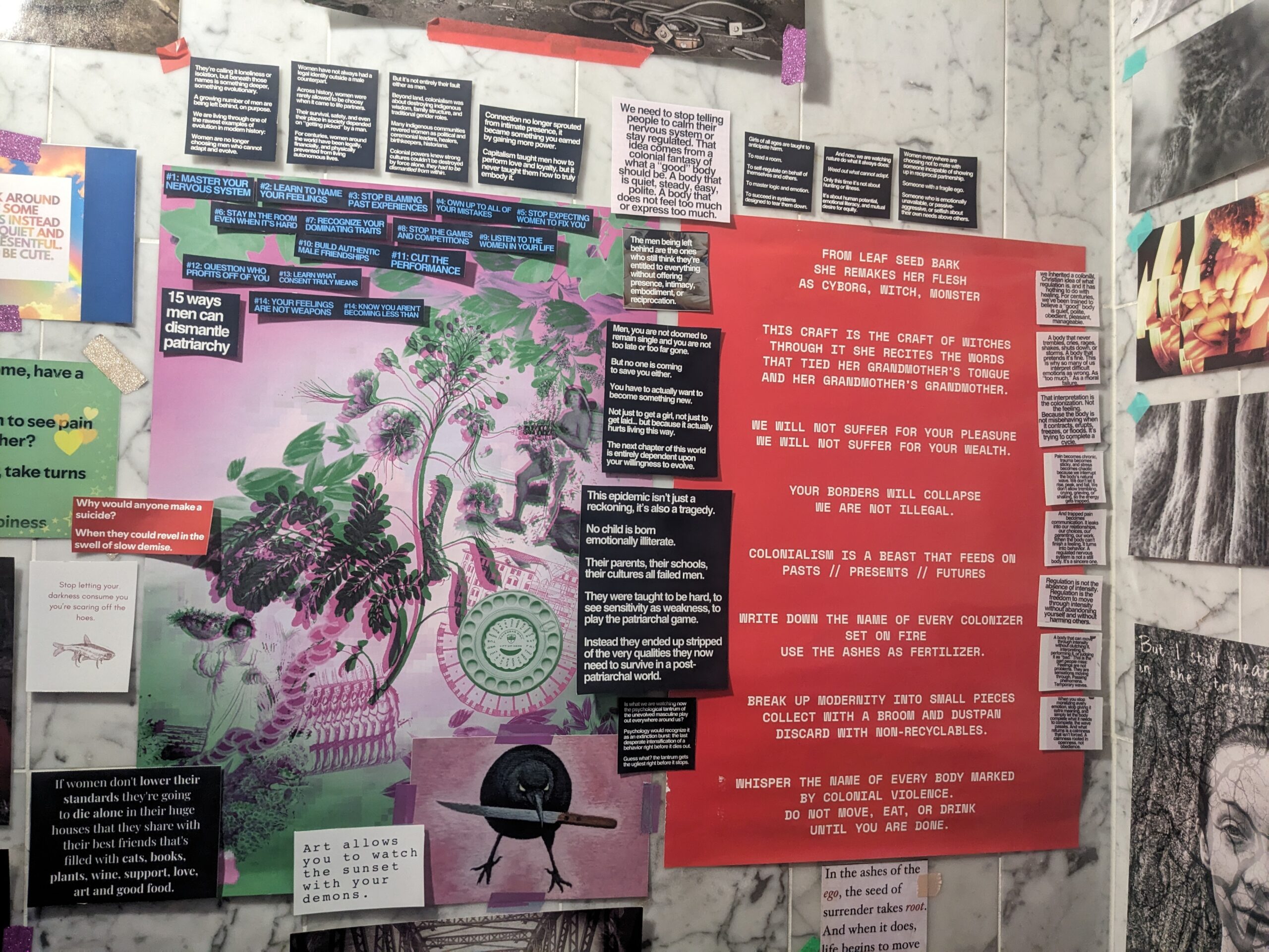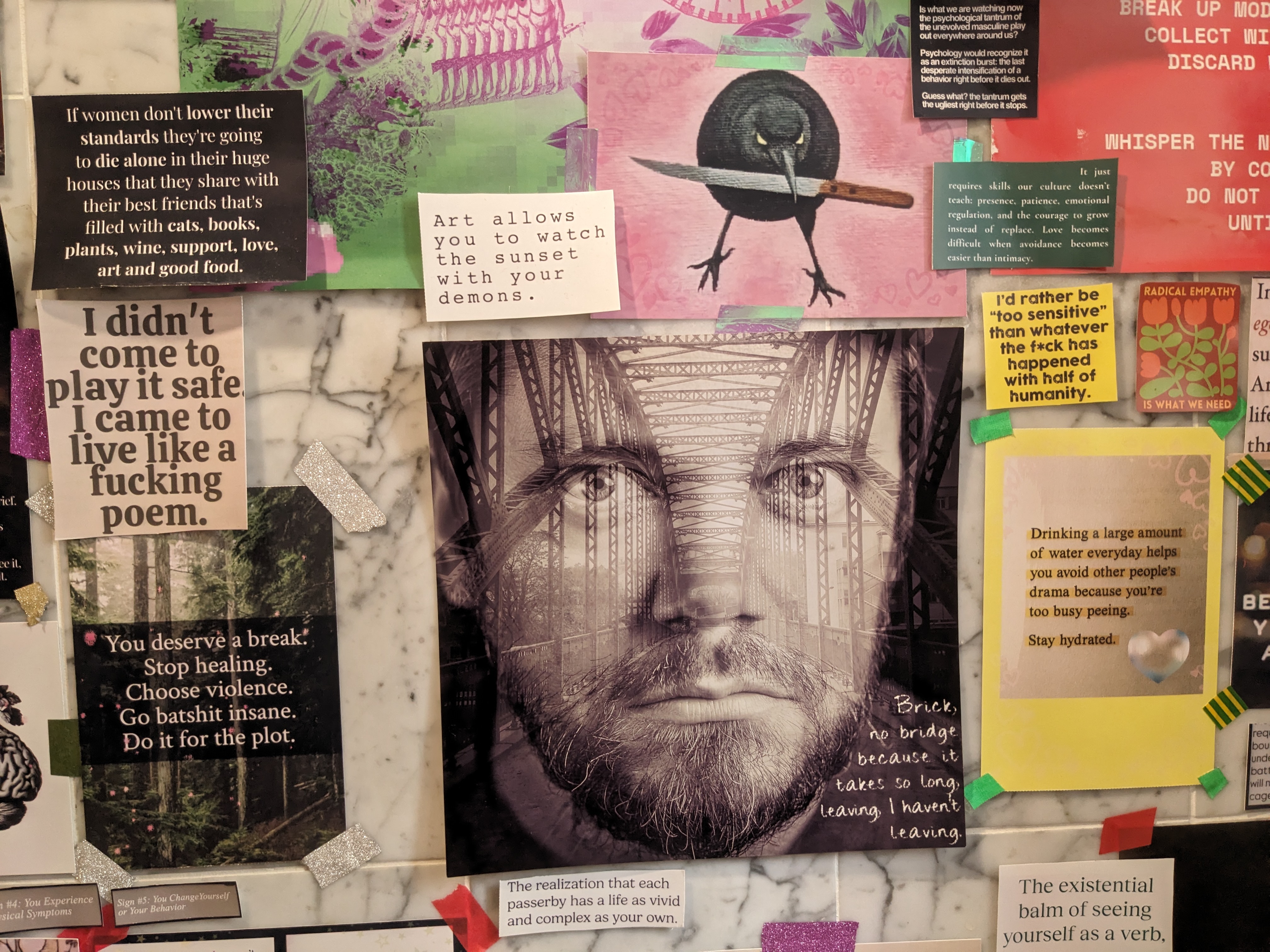 It looks like someone — simply done being polite — took the inside of their brain and plastered it everywhere. Like the inside of a teenager’s locker — if that teenager had a PhD in sociology and a lot of unresolved trauma. Welcome and enjoy!
