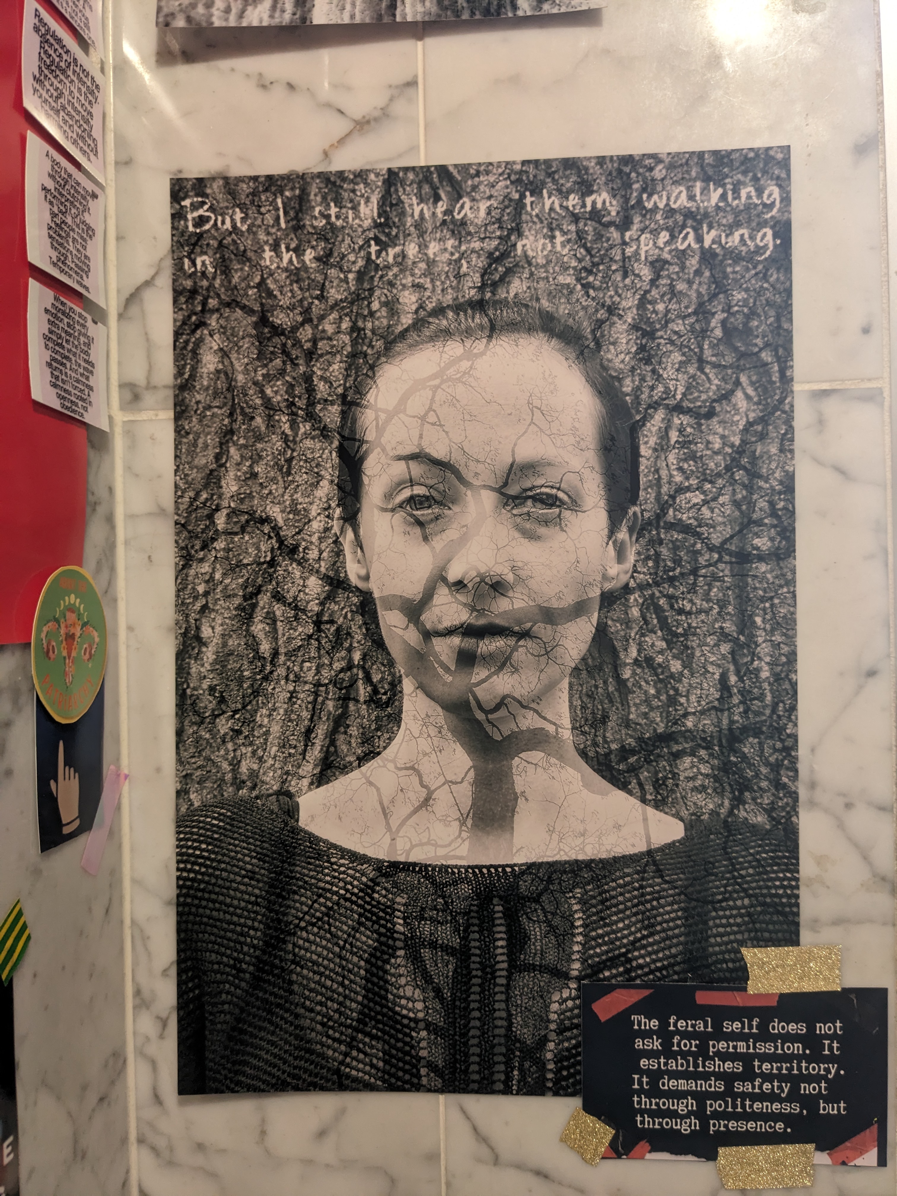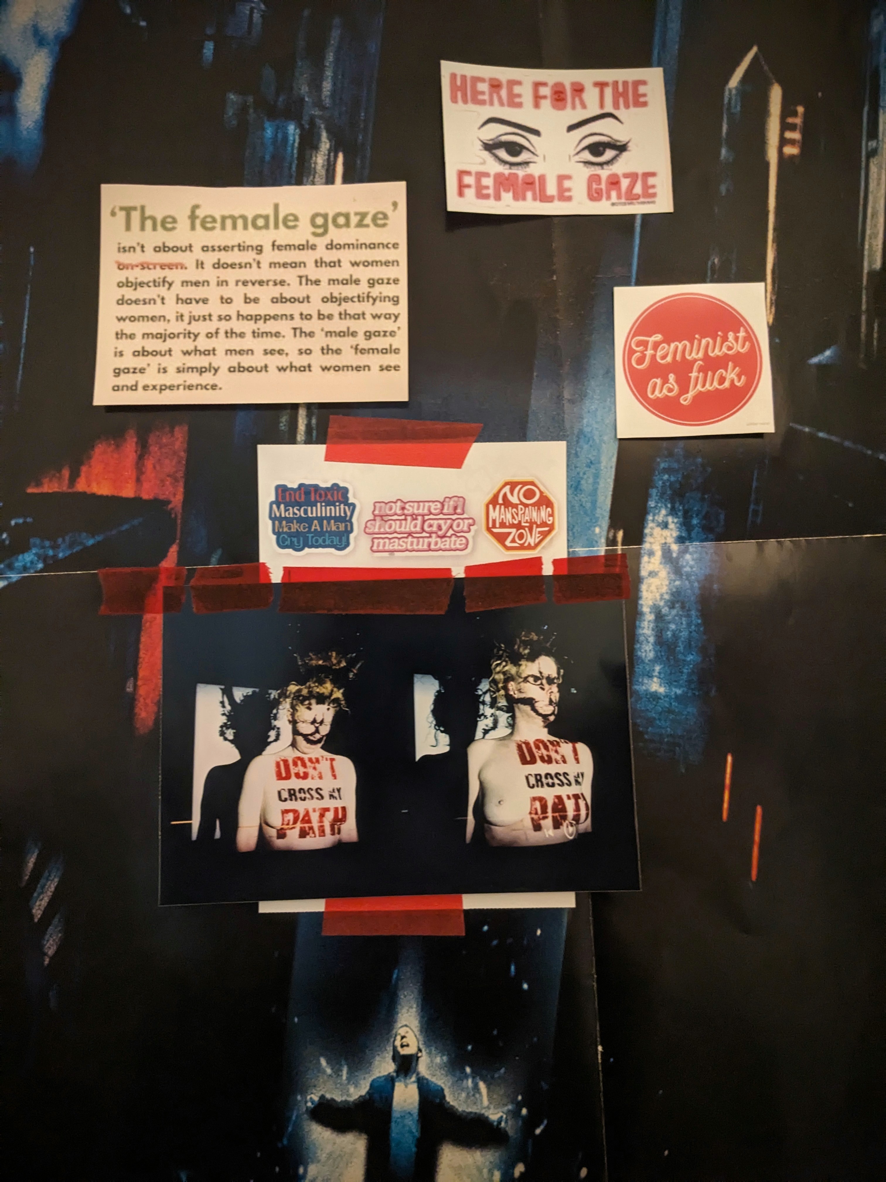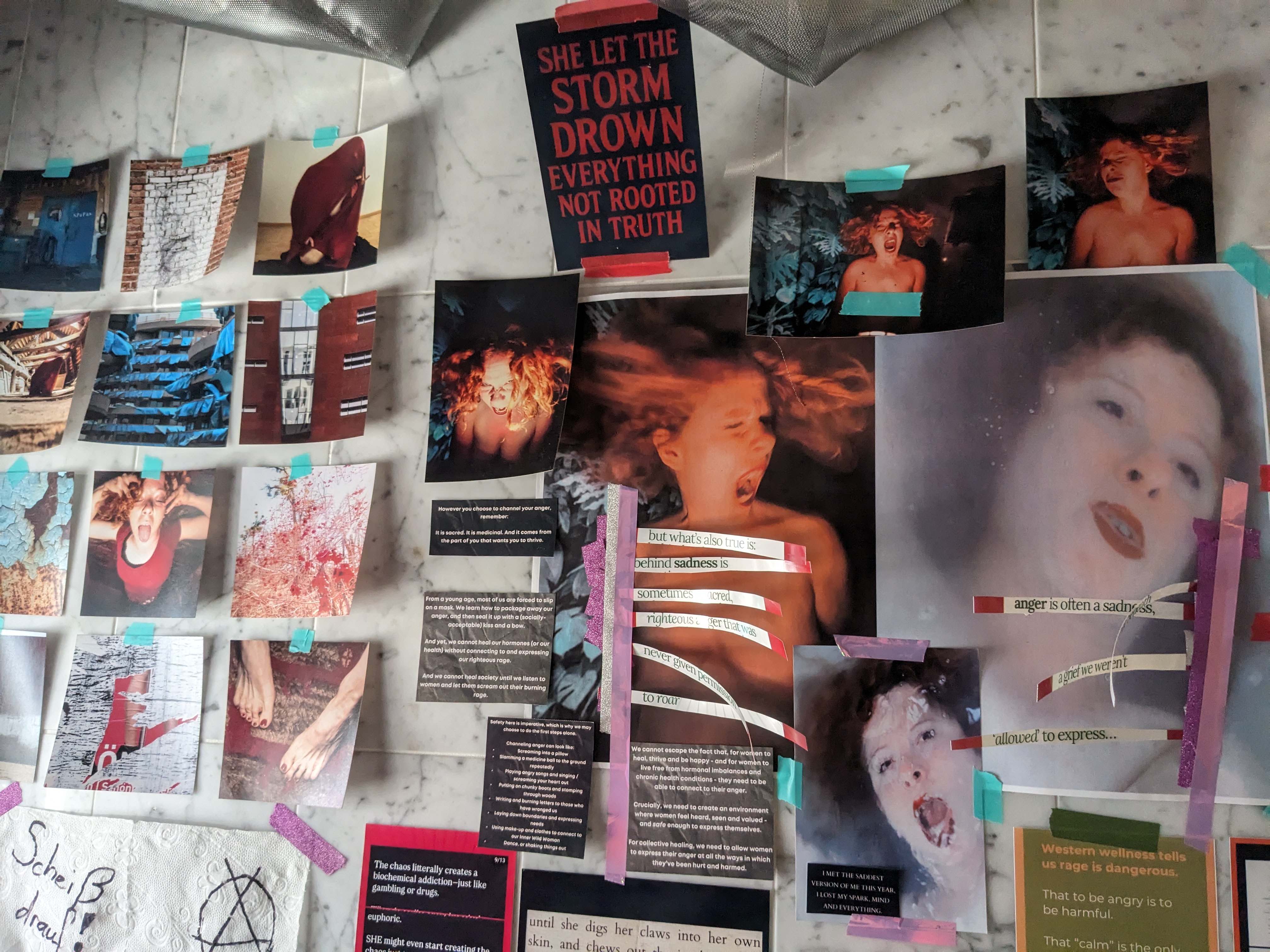 Combining analogue and digital media, the project creates chaotic visual collages inspired by meme culture, zines and DIY installation practices. It functions as a visual manifesto — rejecting politeness, reclaiming the gaze, and relocating pain from the body into art.