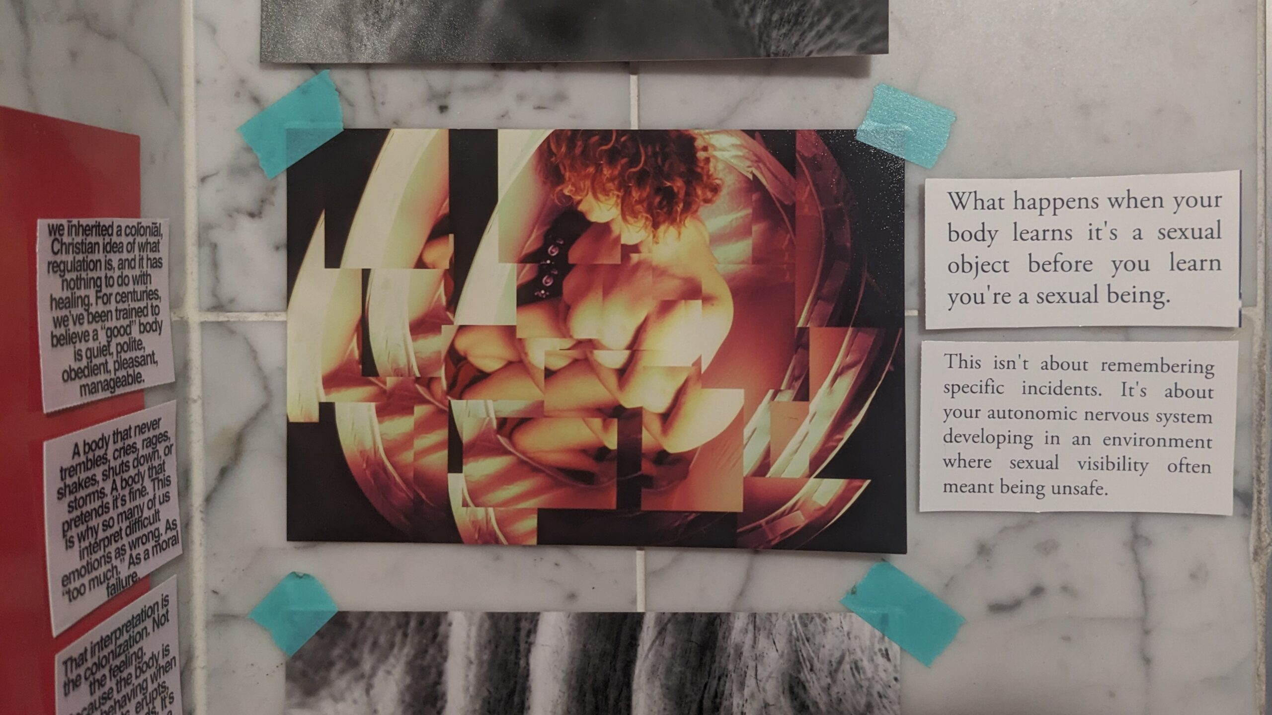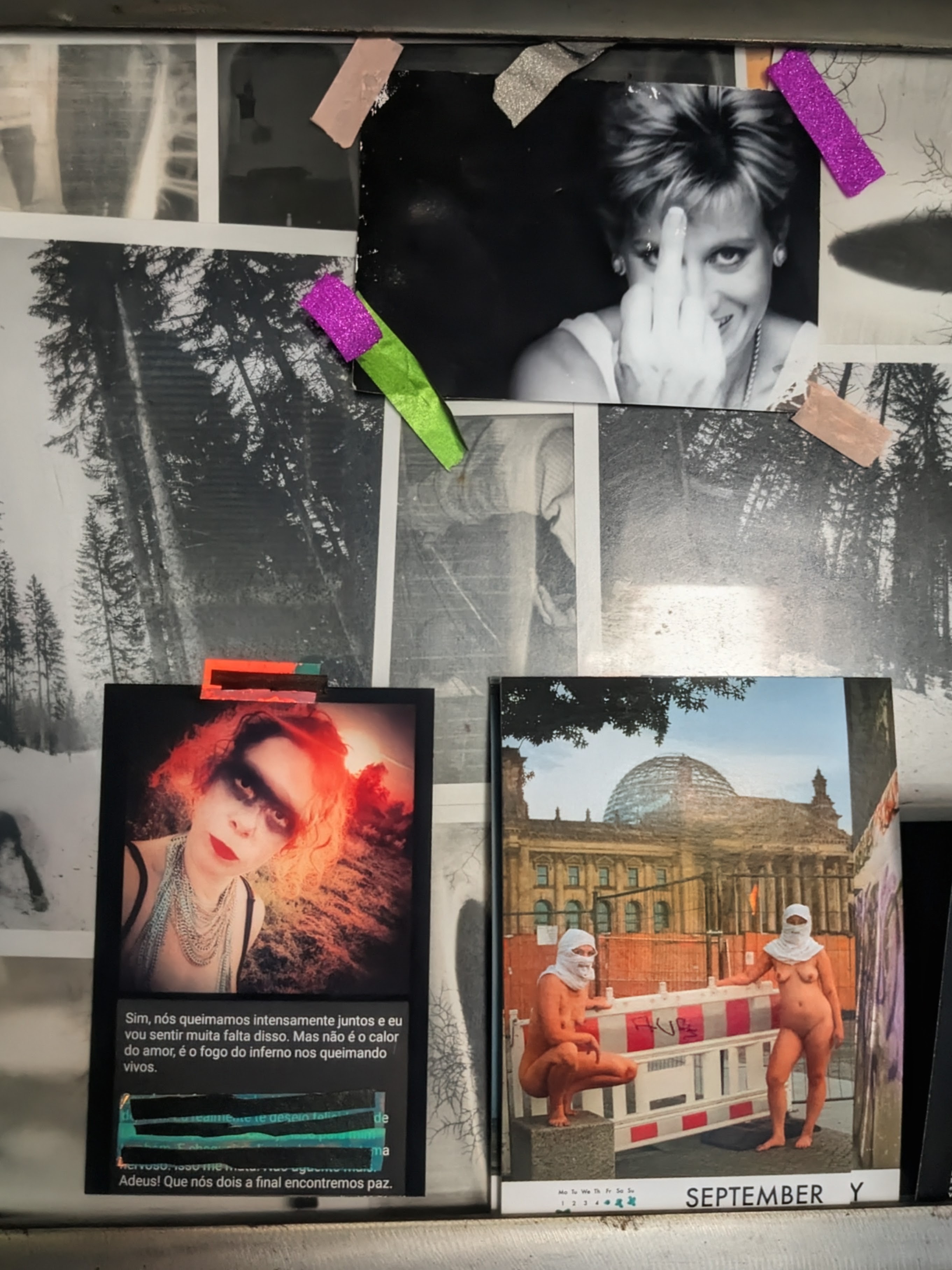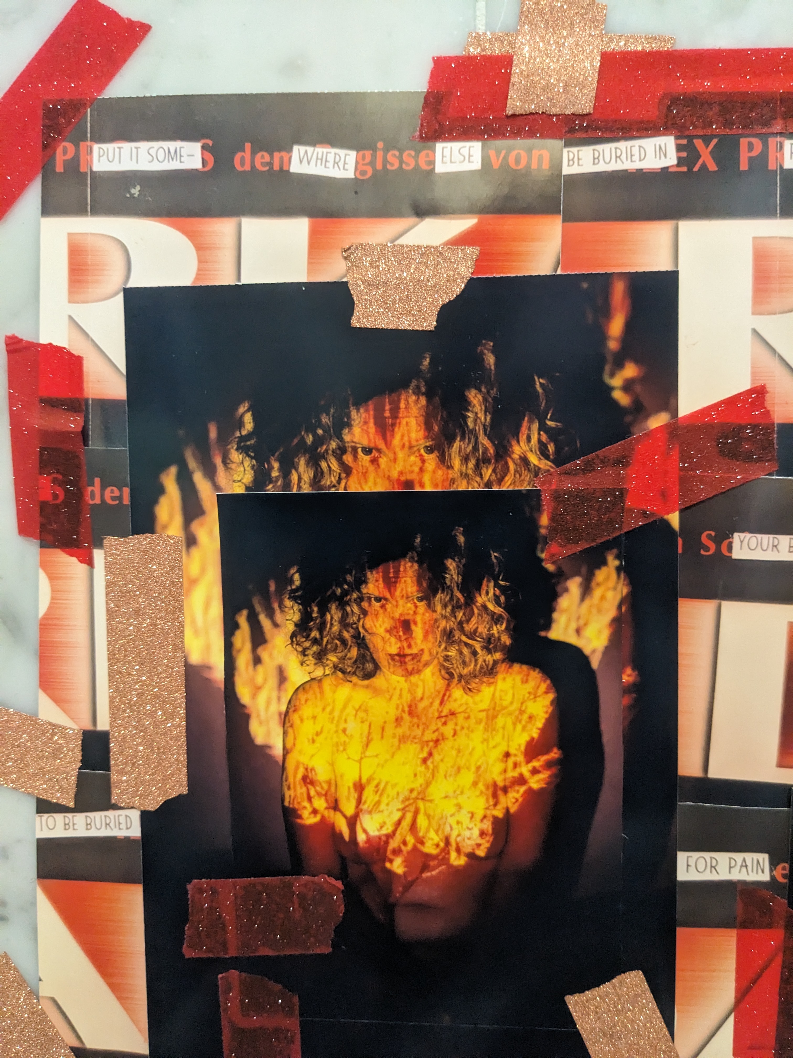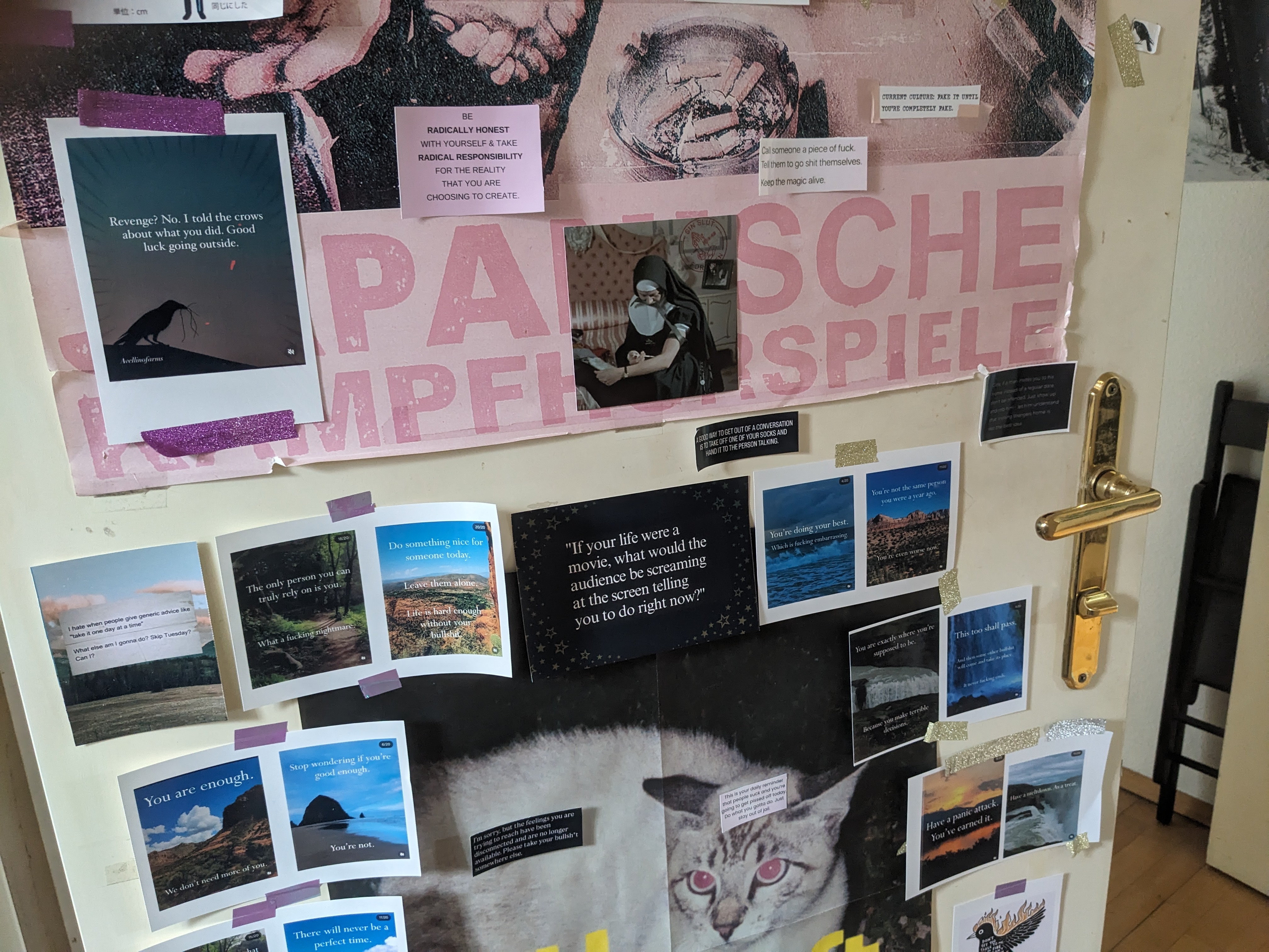 Combining analogue and digital media, the project creates chaotic visual collages inspired by meme culture, zines and DIY installation practices. It functions as a visual manifesto — rejecting politeness, reclaiming the gaze, and relocating pain from the body into art.